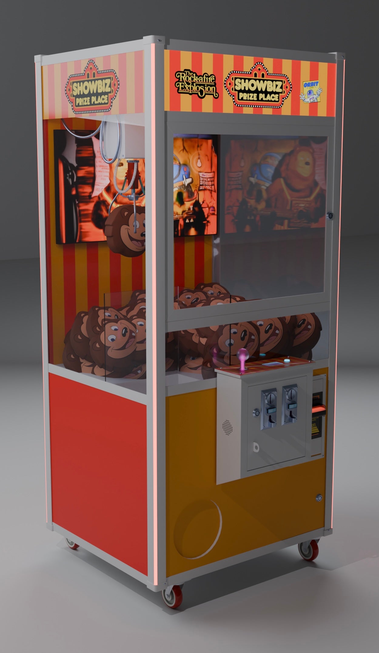 Official promotional render of the ShowBiz Prize Place claw machine, facing to the right.