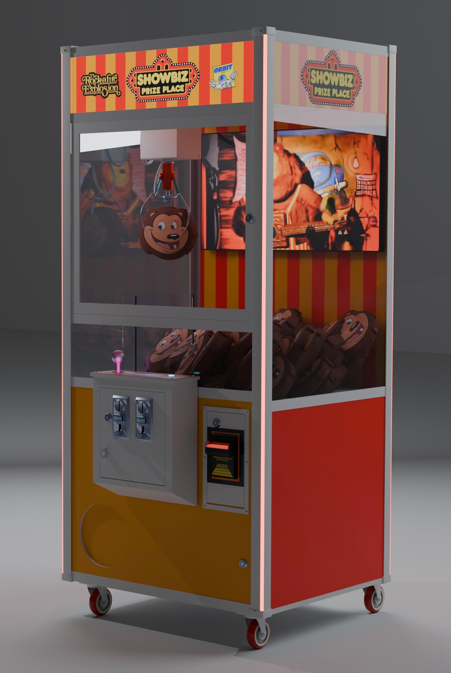 Official promotional render of the ShowBiz Prize Place claw machine, facing to the left.